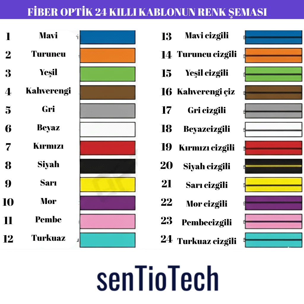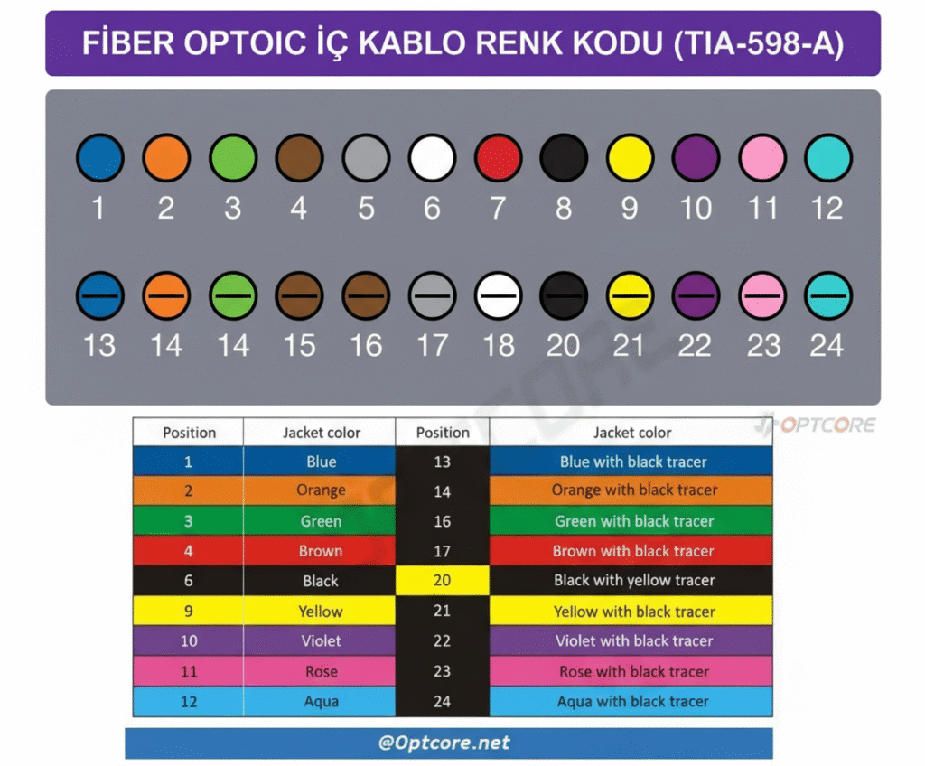 1. Fiber Tanımlama: Çok sayıda fiberin bulunduğu bir kablo veya tüp içerisinde, her bir fiberin benzersiz bir şekilde tanımlanmasını sağlar. Örneğin, 1. sıradaki fiberin her zaman Mavi, 13. sıradakinin ise Mavi ve Siyah İzli (Blue with black tracer) olduğunu bilmek, teknisyenlerin karışıklık yaşamadan doğru fiberi bulmasını ve sonlandırmasını sağlar.